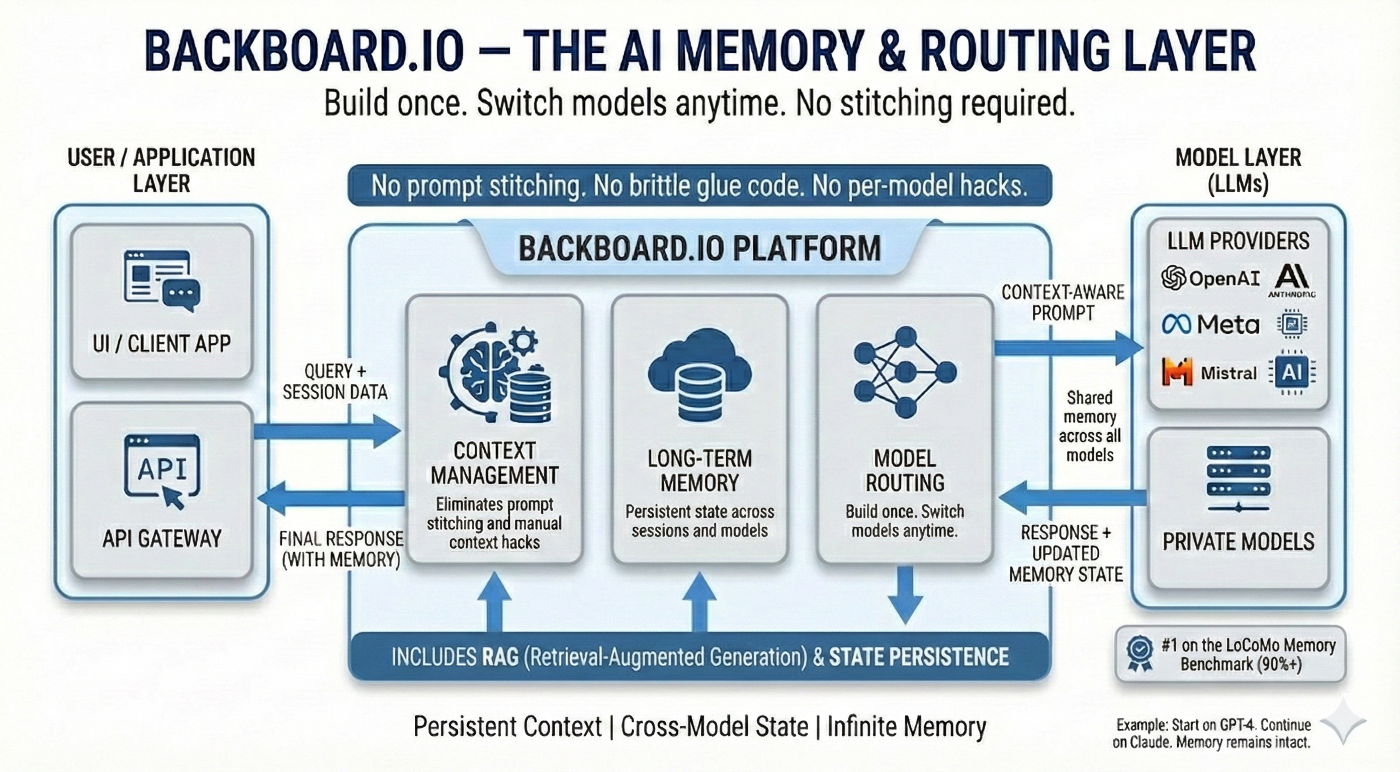 Backboard.io is a developer-first AI infrastructure platform designed to serve as the persistent state layer for Large Language Models (LLMs). Currently ranked #1 on the LoCoMo benchmark, the platform enables true memory-native AI systems, moving beyond simple conversational history to retain high-fidelity, long-term context required for complex SaaS tools and autonomous agents. Backboard.io supports multi-model orchestration across more than 2,000 LLMs, providing a portable memory layer that works across providers rather than locking developers into a single vendor. By combining persistent AI memory, context management, and stateful orchestration, Backboard allows teams to deploy a secure, production-ready AI stack in minutes. The company is focused on solving the industry's "stateless" problem: giving AI the ability to remember, retrieve, and build on past interactions to support sophisticated, multi-step workflows.